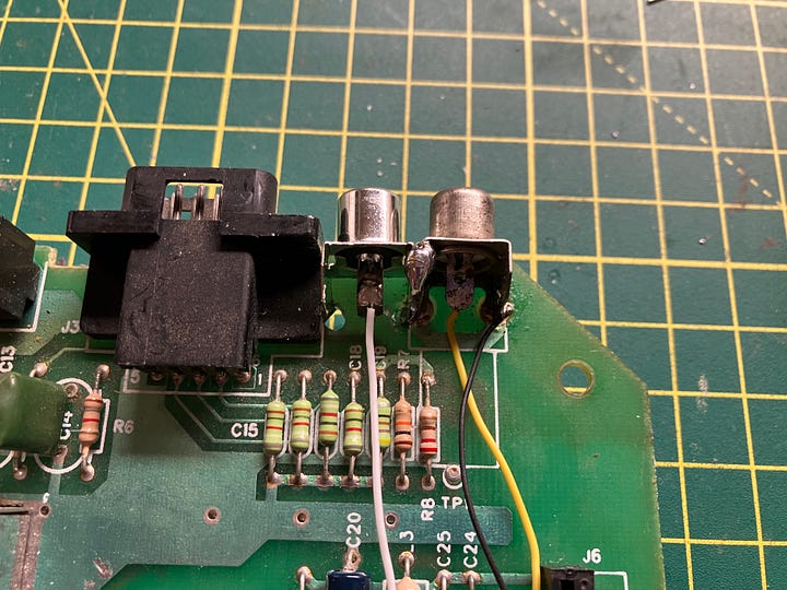 I drilled some small holes in the PCB and mounted an audio output component next to the newly modified video output. I filed out an appropriate hole in the back of the case for the new hole. I also gently ran over the text on the case with a silver paint pen to give the embossed letters some clarity.
