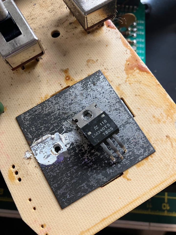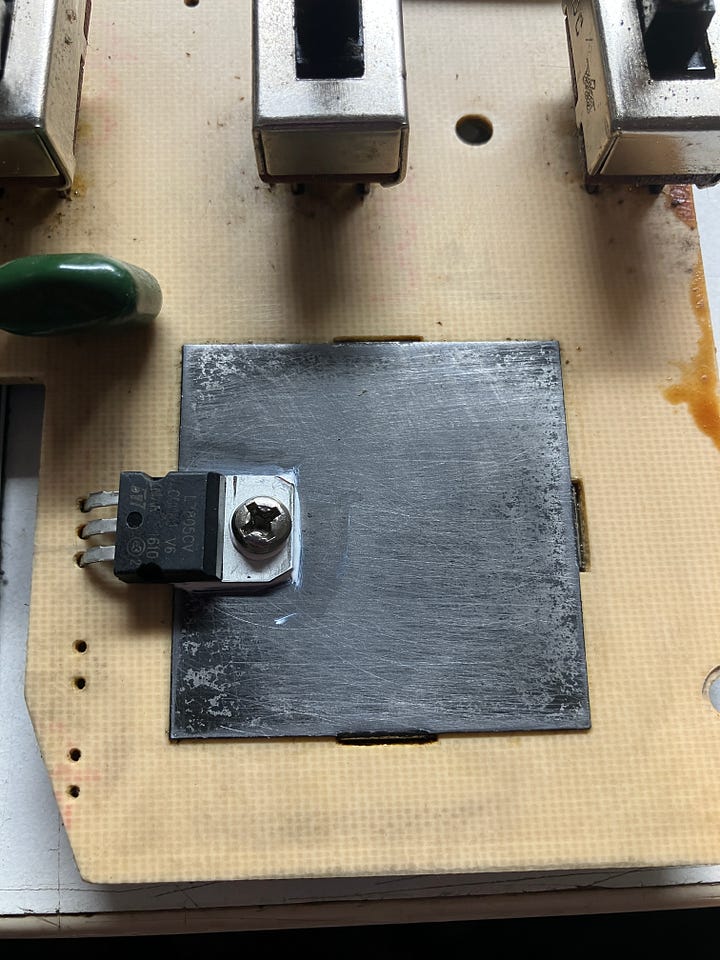 I removed the old mod and replaced it with one of mine, which I know are good. I powered the unit on and couldn’t get it going. I checked out the voltage regulator, as they are usually the first port of call for failures. It wasn’t generating a good +5VDC, so I renewed it and gave the heat sink plate a bit of a buffing as well as some new heat sink compound (probably the wrong amount)