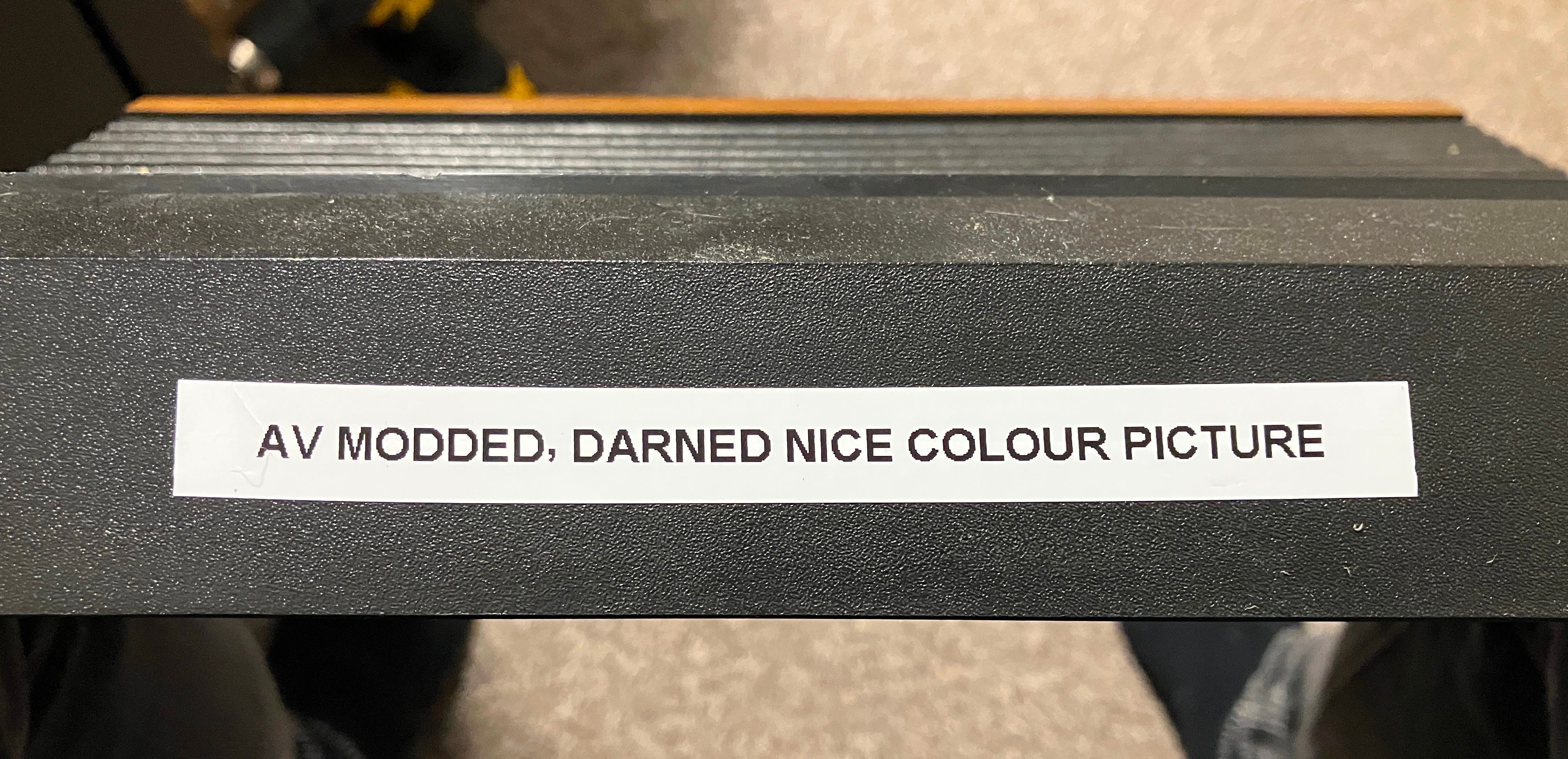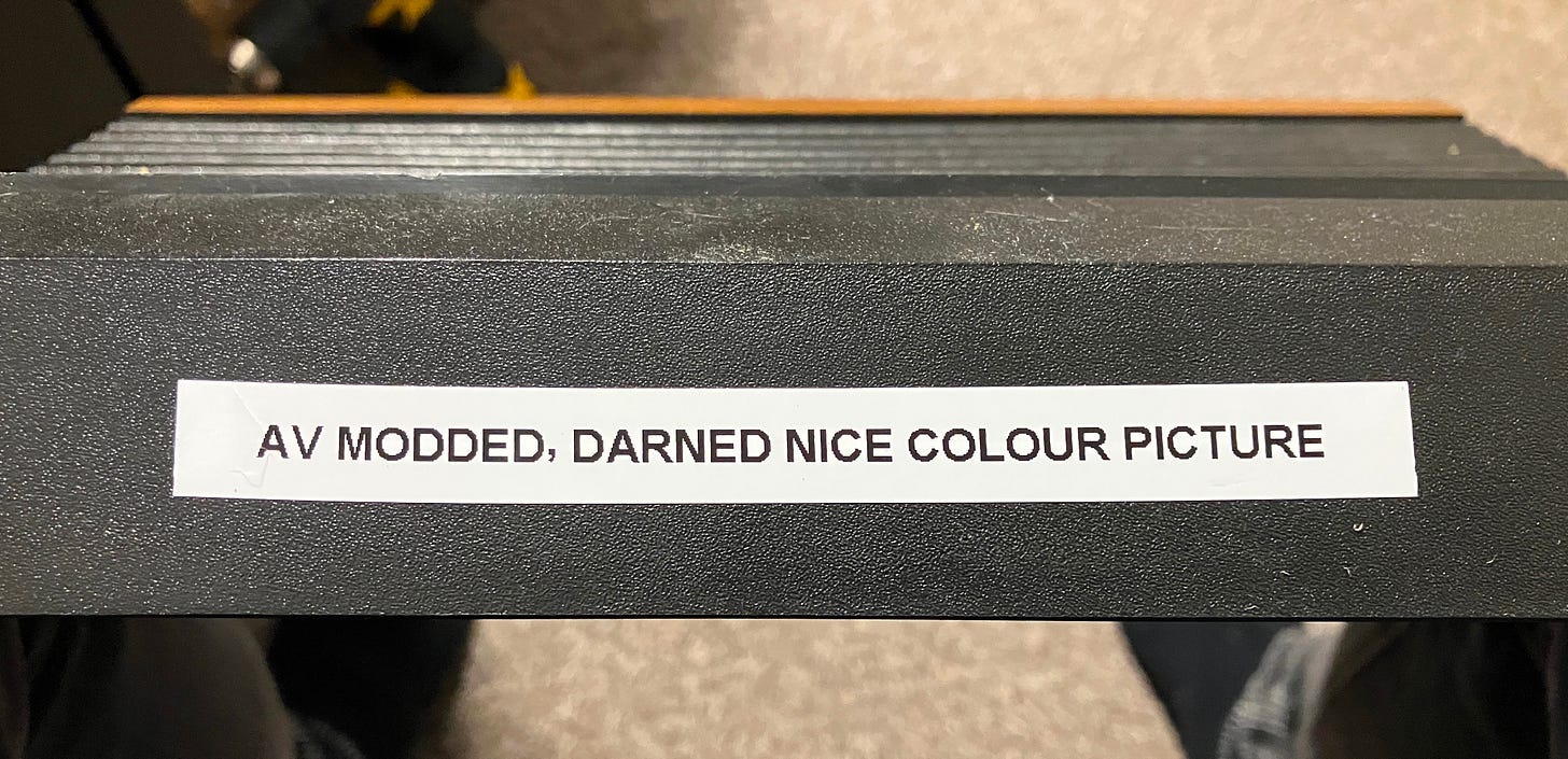 Took the thing apart and did the usual composite AV mod. I use my own PCBs (got them printed from Elecrow. Some sort of shared project). The pcbs need some SMD components soldering to them : a single 2.2K,3.3K,75ohm resistor and a transistor. You also need to remove a few parts from the Atari pcb and tap the video signal and power to the mod PCB. I always use the Teignmouth Software Blog guides
